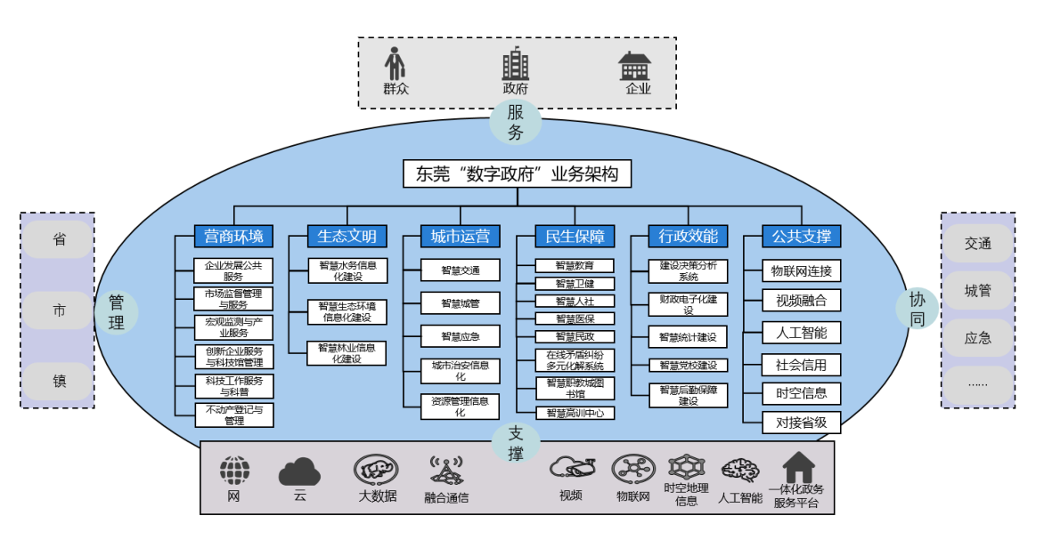 東莞市“數字政府”建設突破傳統業務條線垂直運作、單部門內循環模式,以管理、服務、協同和支撐為職能線,以營商環境、生態文明、城市運營、民生保障、行政效能和公共支撐為業務線,構建縱橫貫通的整體型“數字政府”業務體系。業務架構圖如下所示: