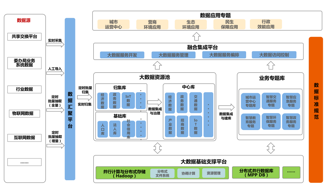 依托統一的數據標準規范,從數據采集、數據匯聚、集成治理、數據存儲到數據開放共享和數據服務,建設完整的大數據架構體系,實現數據全生命周期的管理,支撐大數據的業務應用。