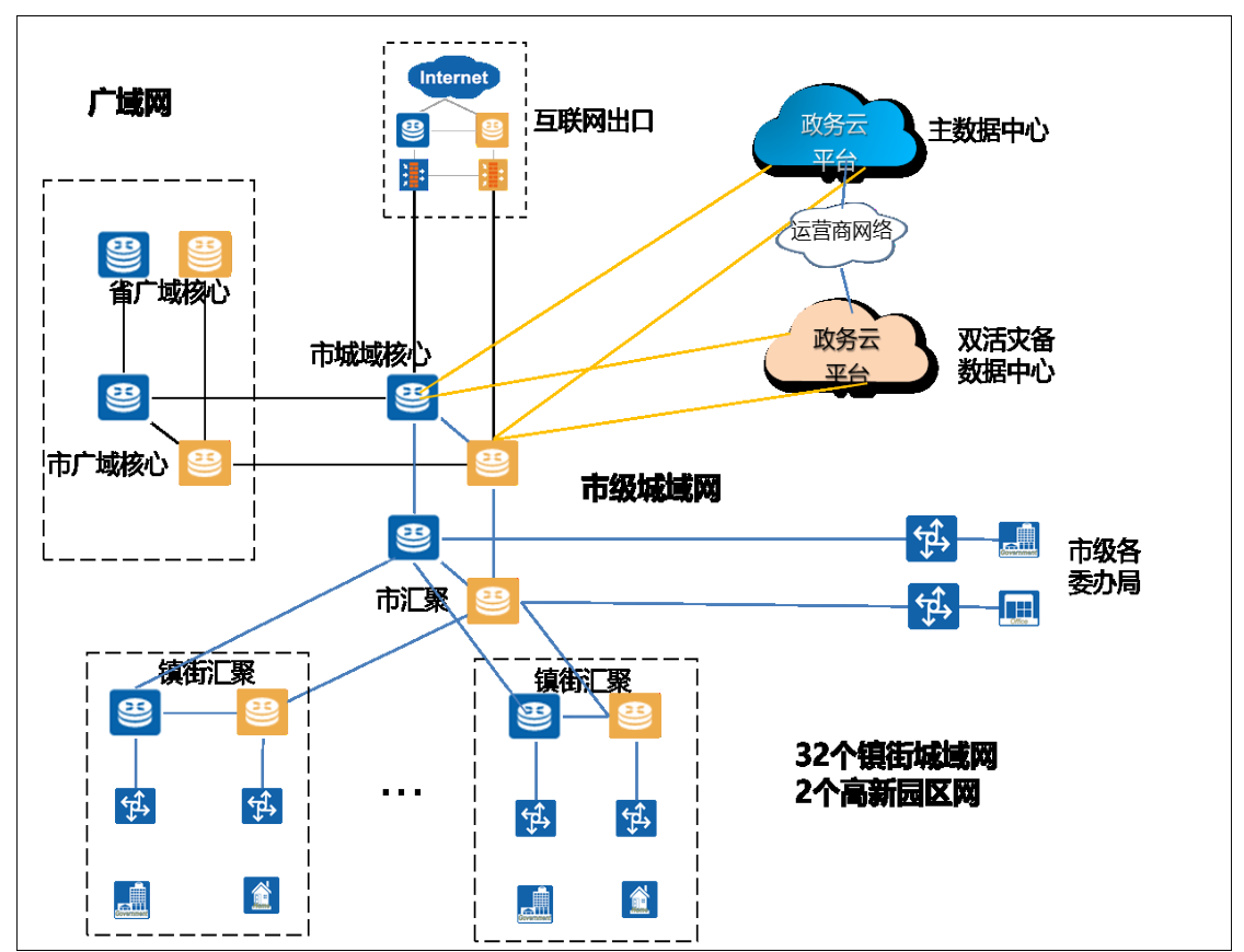市政務外網通過市廣域核心節點向上聯接省廣域核心節點,通過市城域核心節點聯接政務云中心和互聯網出口區,再通過市匯聚節點聯接市級各委辦局網絡和鎮街匯聚節點。市城域核心、市匯聚、鎮街匯聚設備作為政務外網骨干設備,應具備大容量,高性能,良好的擴展性,支持 MPLS VPN、SRV6、SDN 等新技術。