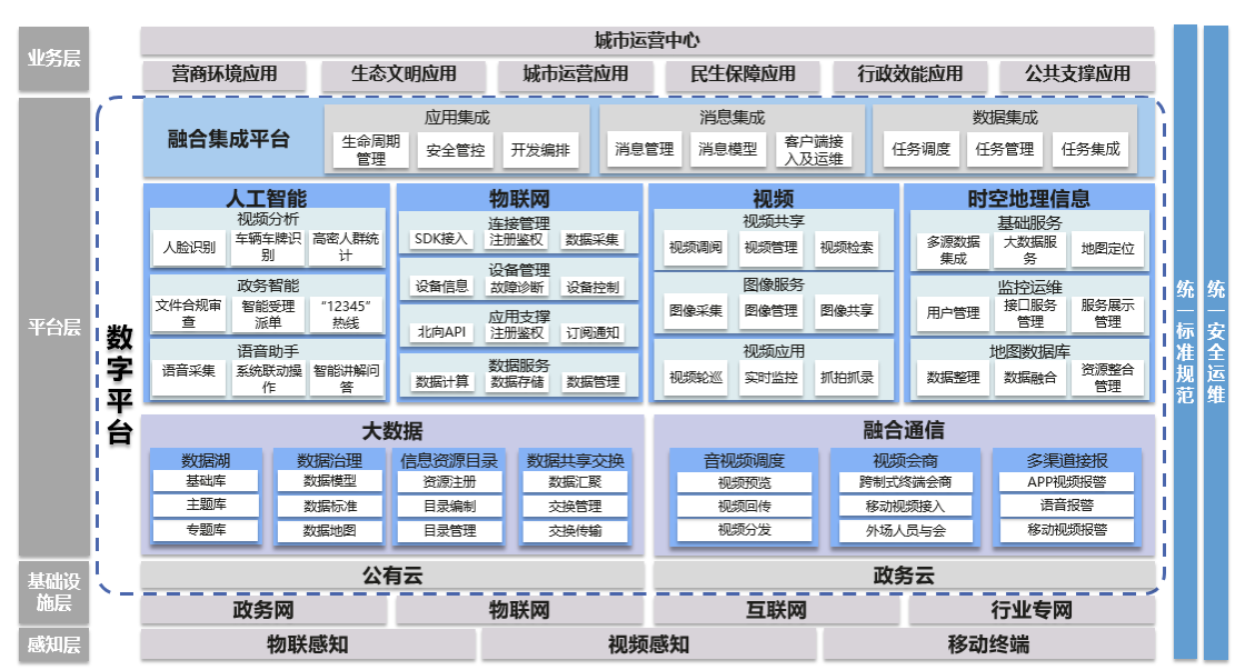 技術實現以數字平臺為核心,提供包括云計算、大數據、時空信息服務、視頻云、融合通信、物聯網、人工智能等能力,統一由能力開放平臺進行服務發布和接口管理。