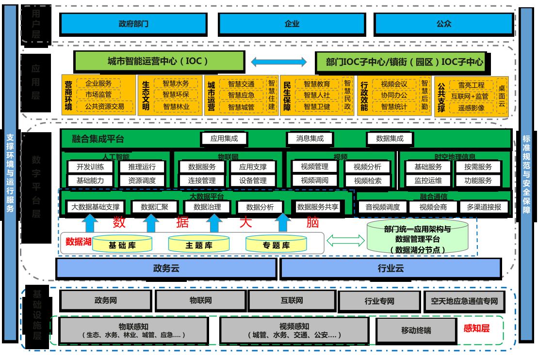 東莞市“數字政府”建設采用向下聯結城市無處不在的智能終端,中間利用橫向融合云、人工智能、大數據、視頻、融合通信,時空地理信息、物聯網等新 ICT 技術的數字平臺,向上提供服務能力支撐智慧應用的總體架構。總體架構圖如下所示: