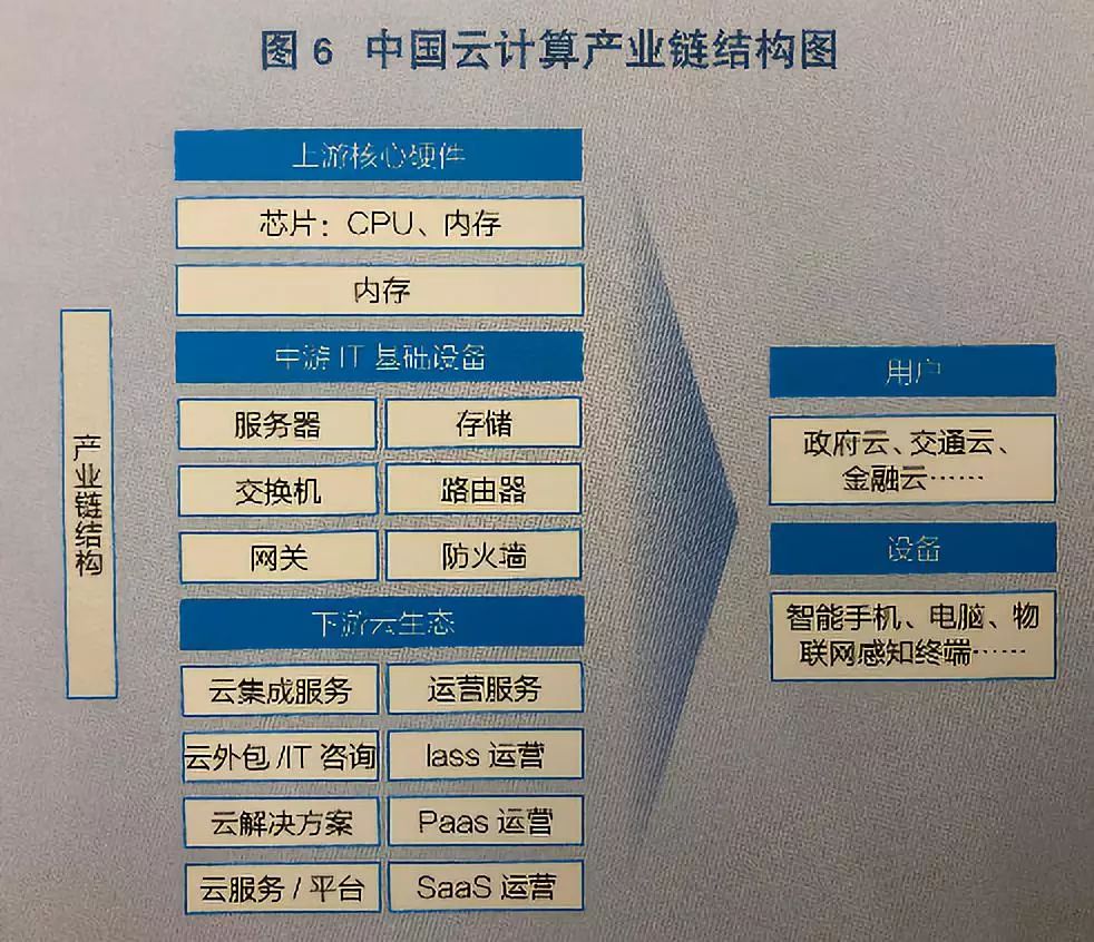 白皮書也重點分析了中國云計算產業(yè)鏈的基本情況。按照產業(yè)機構來看,云計算產業(yè)鏈可以分為上游核心硬件,包括芯片、CPU、內存、閃存;中游IT基礎設備,包括服務器、存儲設備、網絡設備等;以及下游云生態(tài),包括基礎平臺、云原生應用等三部分。