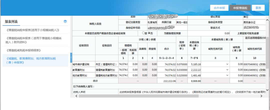 (6)檢查附加稅數(shù)據(jù),填寫完成相關(guān)數(shù)據(jù)項后,點擊【合并申報】按鈕,進行合并申報;