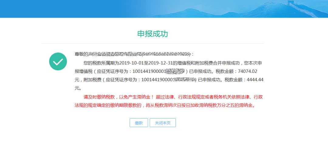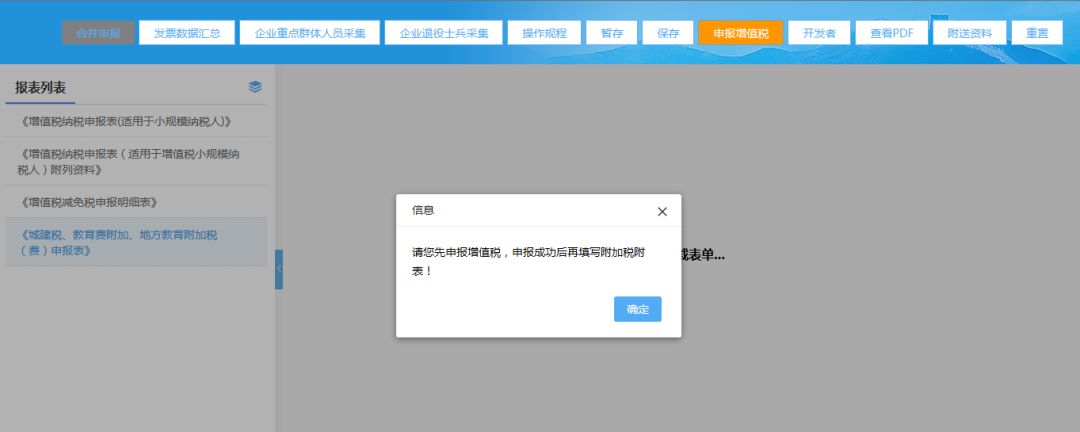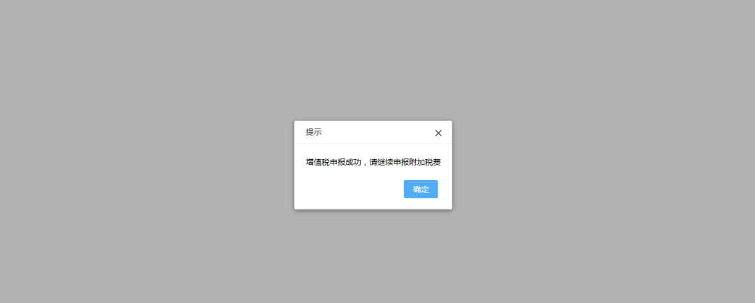 (4)增值稅申報成功后,系統(tǒng)返回增值稅申報成功,點擊【確定】按鈕可進行附加稅申報;