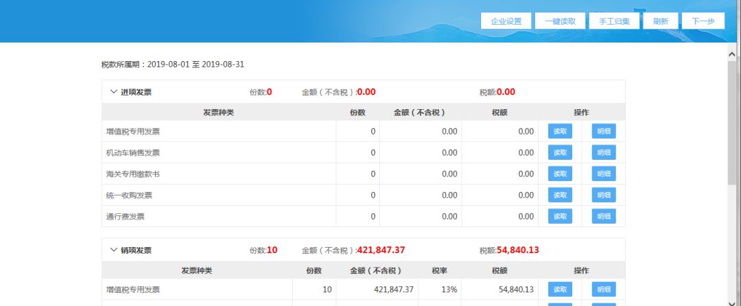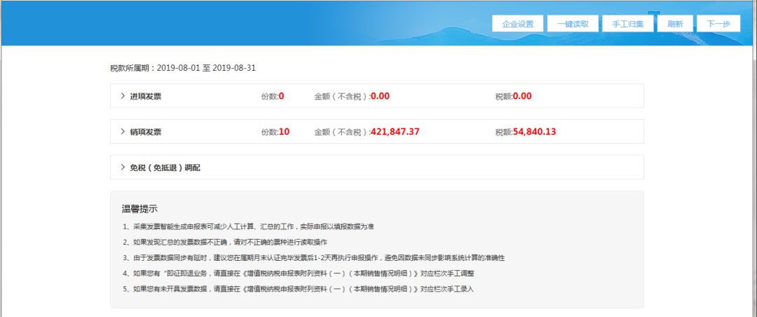 (2)進入發(fā)票匯總界面后,系統(tǒng)自動獲取當期所有的進銷項發(fā)票數(shù)據(jù);