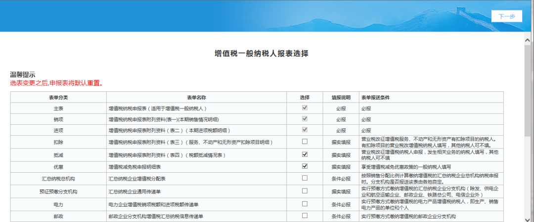 (3)發(fā)票匯總界面點擊“下一步”按鈕,系統(tǒng)進入增值稅一般納稅人選表設(shè)置界面,企業(yè)根據(jù)自己實際業(yè)務(wù)發(fā)生情況勾選需報送的申報表,勾選完成點擊“下一步”進入增值稅納稅申報表,如下圖: