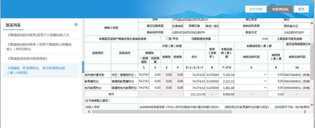 (5)檢查附加稅數(shù)據(jù),填寫完成相關(guān)數(shù)據(jù)項后,點擊【合并申報】按鈕,進行合并申報;