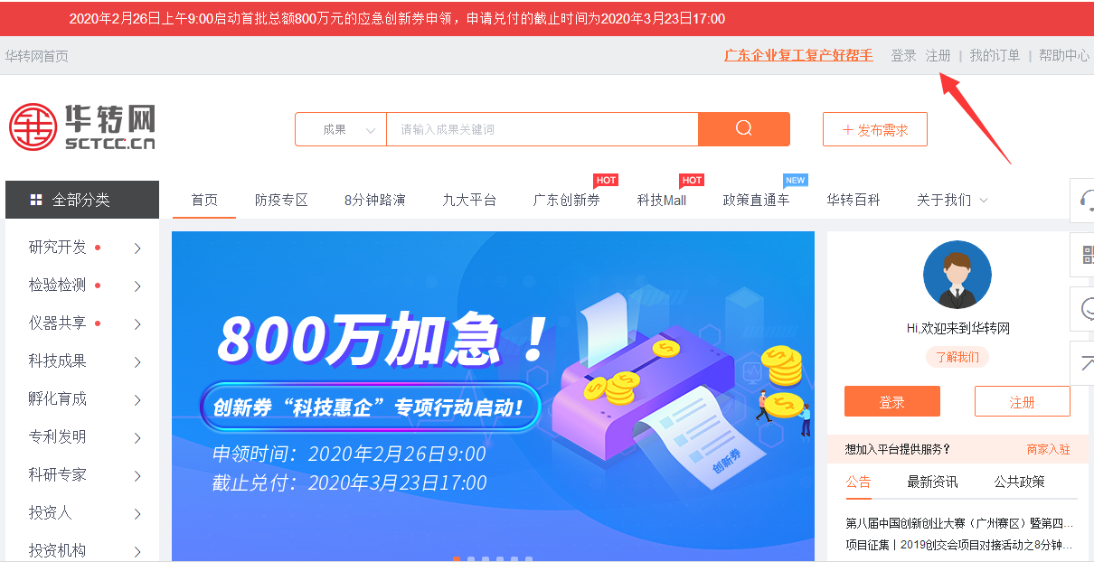 打開廣東省創新券工作實施的官方平臺——華轉網(http://www.sctcc.cn),并完成注冊步驟。
