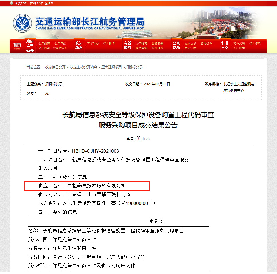 熱烈祝賀中檢賽辰技術(shù)服務(wù)有限公司(簡(jiǎn)稱:賽辰)中標(biāo)長(zhǎng)航局信息系統(tǒng)安全等級(jí)保護(hù)設(shè)備購(gòu)置工程代碼審查服務(wù)采購(gòu)項(xiàng)目,此次中標(biāo)成功既是長(zhǎng)航局對(duì)賽辰信息系統(tǒng)代碼審查技術(shù)積累和實(shí)施能力的肯定,也為公司擴(kuò)展信息安全測(cè)評(píng)服務(wù)領(lǐng)域邁出了堅(jiān)實(shí)步伐。