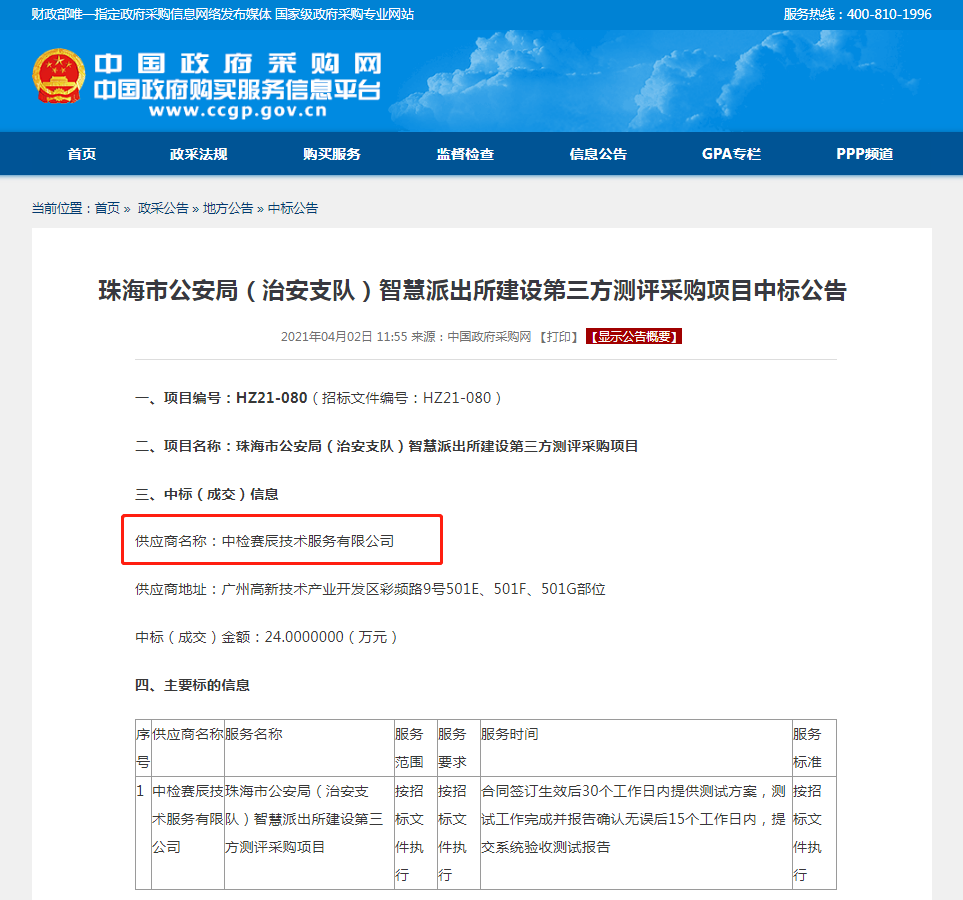熱烈祝賀中檢賽辰技術服務有限公司(簡稱:賽辰)中標珠海市公安局(治安支隊)智慧派出所建設第三方測評采購項目!中標金額:24萬元。